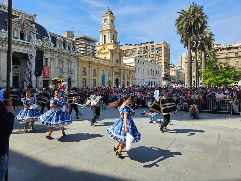 Cerca de 10 mil personas se congregaron este domingo en la Plaza de Armas para participar en la tradicional procesión de la Virgen del Carmen, patrona de Chile. La jornada comenzó a las 15:30 horas con bailes folclóricos en honor a la Virgen y continuó con un recorrido por las principales calles del centro de la capital. El cardenal Fernando Chomali, arzobispo de Santiago, presidió por segunda vez esta celebración en el marco del Día de Oración por Chile, acompañado por el nuncio apostólico, monseñor Kurian Mathew Vayalunkal.